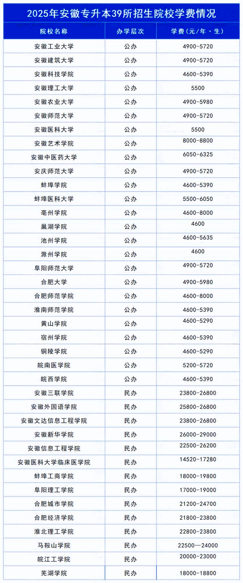 2025年安徽专升本39所招生院校学费标准正式公布!随着专升本扩招政策持续推进,各院校学费差距进一步拉大——公办院校年均学费稳定在4000-8000元区间,而民办院校普遍突破2万元大关,部分热门专业甚至高达3.5万元/年。本文将全面梳理不同办学性质院校的学费梯度,特别标注安徽医科大学临床医学院等"公办背景独立学院"的特殊收费政策,帮助考生在制定备考策略时,同步做好经济成本规划。