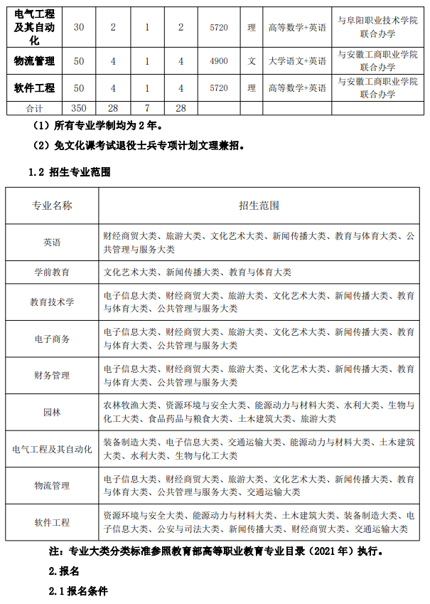 2.1.1 2024 年安徽省省属普通高校(以及经过批准举办普通高等职业教育的成人高等院校)的应届全日制普通高职(专科)毕业生;在安徽省应征入伍的具有普通高职(专科)学历的退役士兵。所有考生须参加省考试院统一组织的报名,并取得考生号。身体条件符合《普通高等学校招生体检工作指导意见》的体检要求,同时毕业专业须符合我校相应专业招生专业范围的要求,毕业专业非以上专业(类)的考生不能报考我校相应专业。