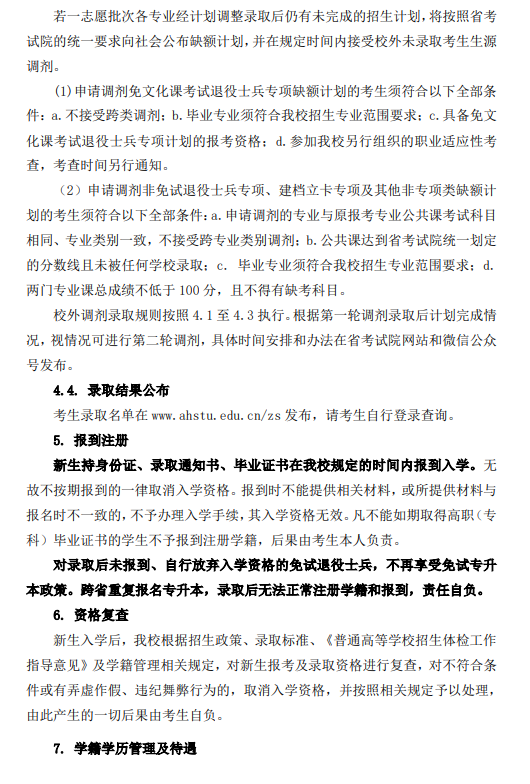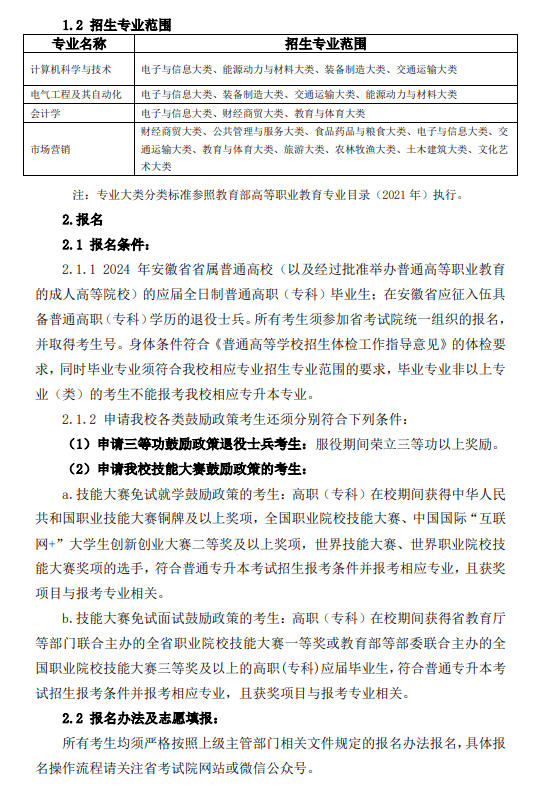 2.3.1 根据上级主管部门相关文件规定,安徽省省属高职(专科)院校毕业考生报考资格由毕业院校进行审核;在安徽应征入伍,在外省院校完成高职(专科)学业的退役士兵报考资格由我校负责审核,审核未通过者不具备我校报名资格。我校将对报考免文化课考试退役士兵专项计划考生资格进行复审。
