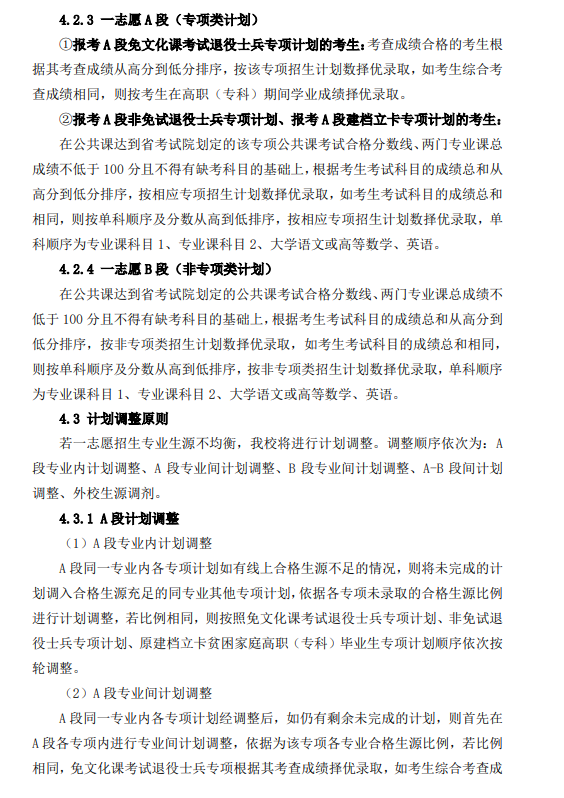 专升本志愿分为 A 段和 B 段,其中 A 段为专项计划志愿,含免文化课考试退役士兵专项计划、非免试退役士兵专项计划和建档立卡考生专项计划。B 段为非专项计划志愿。符合条件的考生可兼报 A 段、B 段志愿。意向报考我校的考生,填报志愿时须仔细阅读我校招生章程,综合考虑招生专业相关要求、专业课考试时间、综合考查安排等因素,避免填报无效志愿。